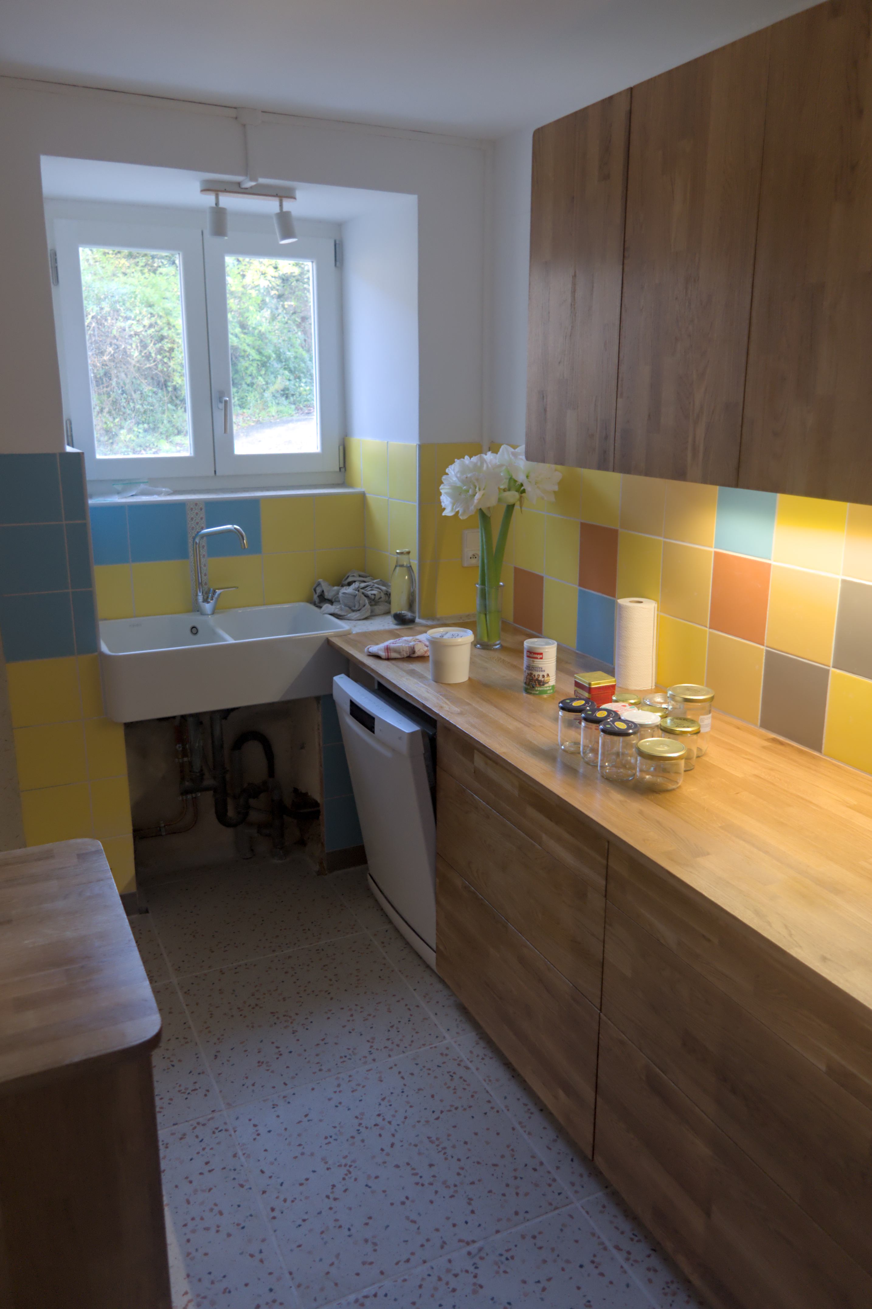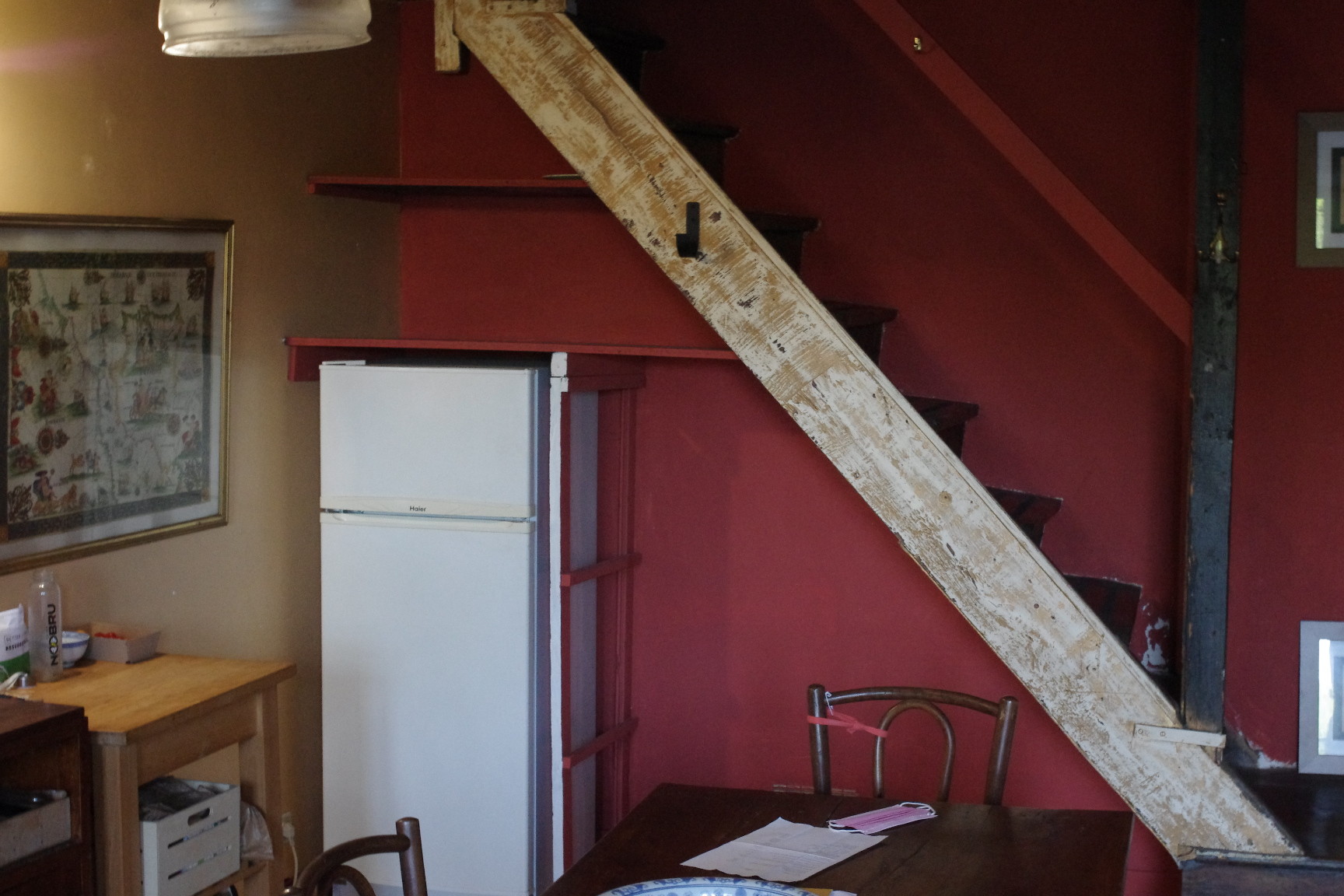 Cet escalier-bibliothèque a été réalisé en panneaux d'hévéa lamellé-collé.